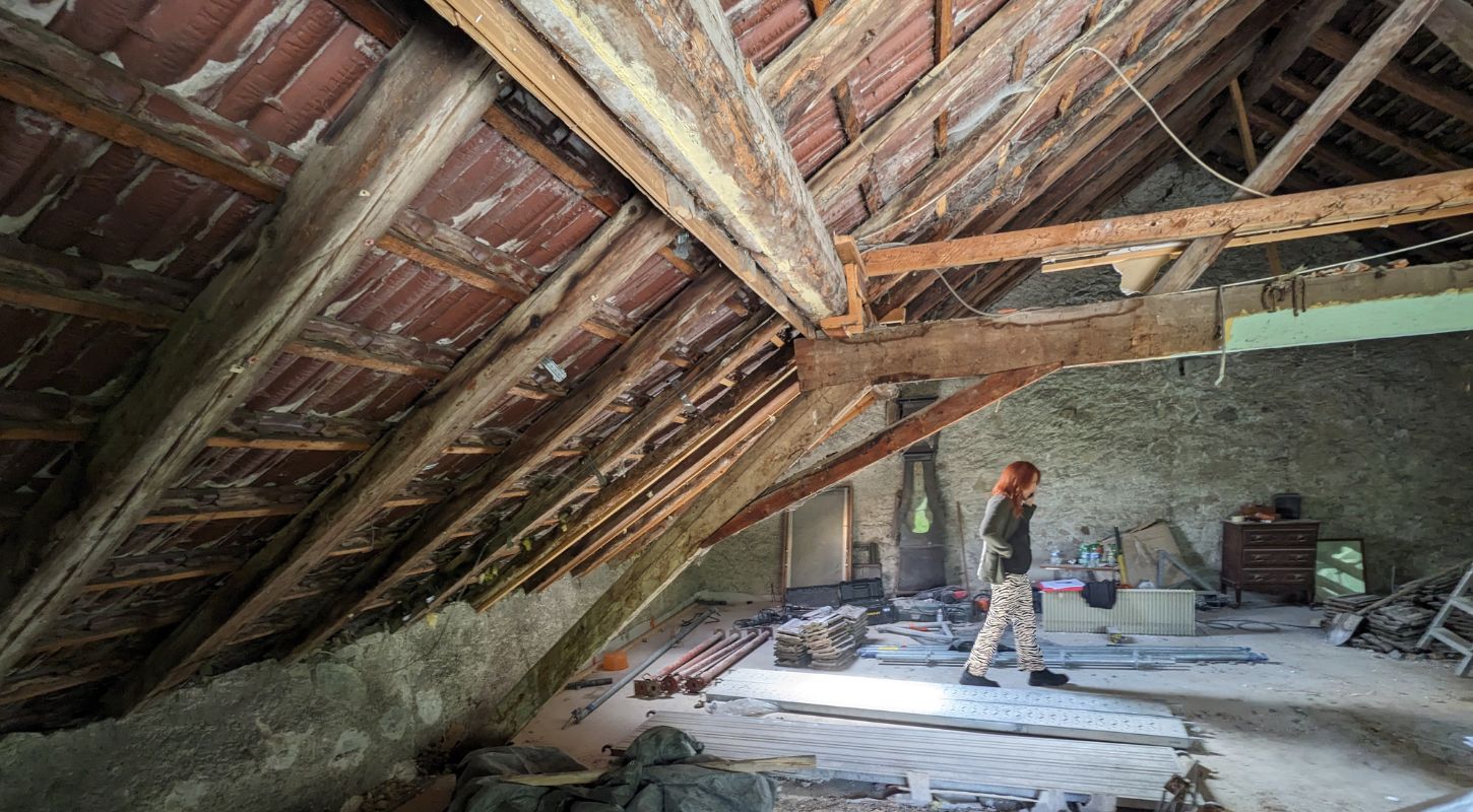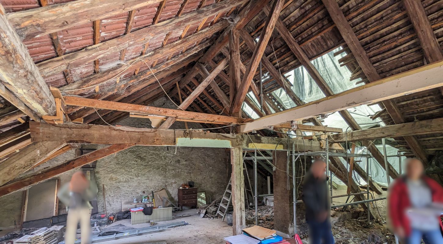 – Démontage de l’ancienne charpente avant de la refaire à neuf, avec son isolation de toiture, sa couverture spécifique et tout le travail de zinguerie (descente des eaux pluviales).