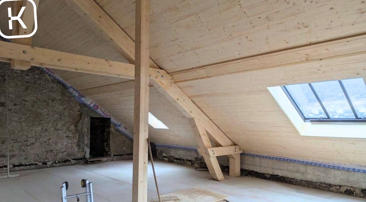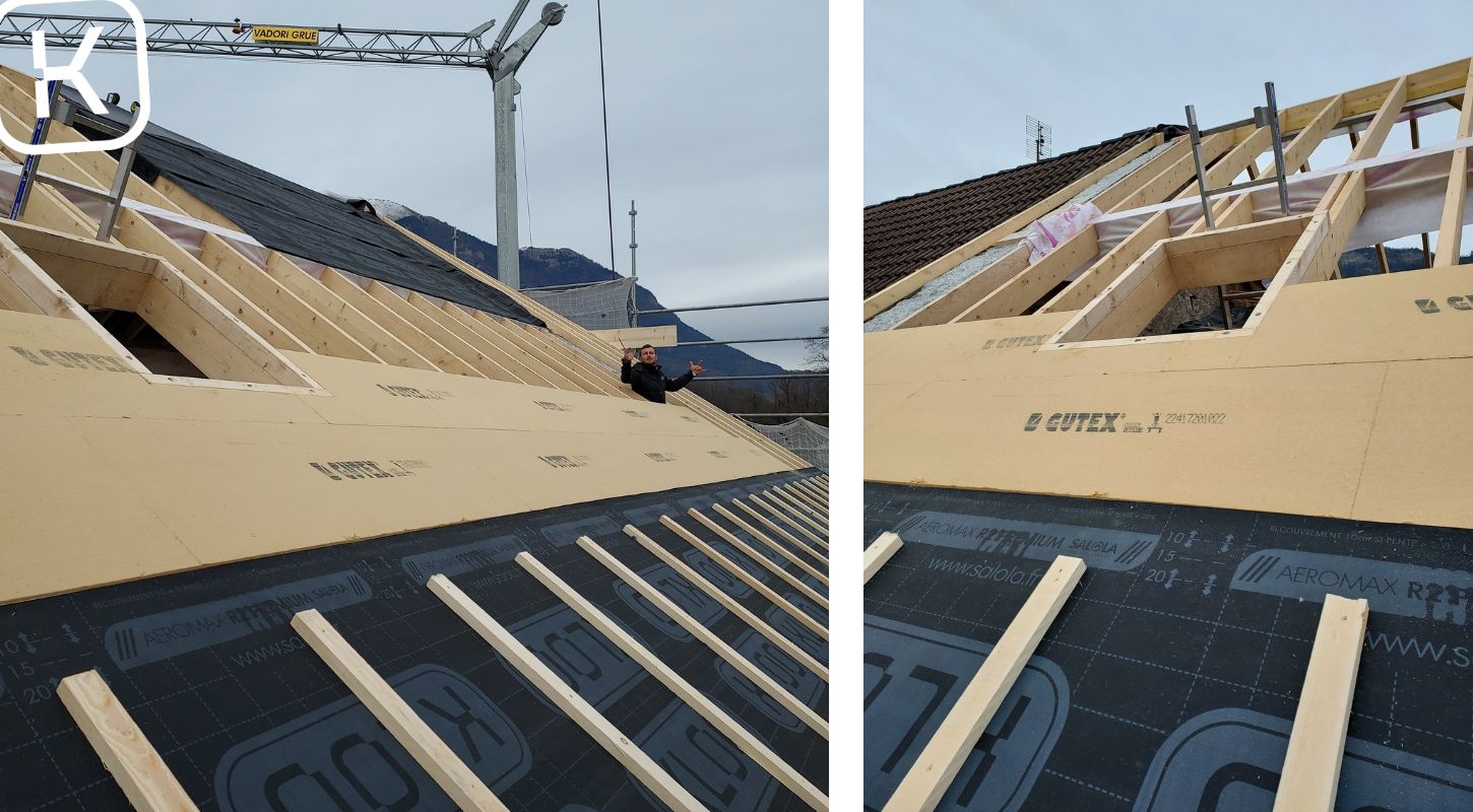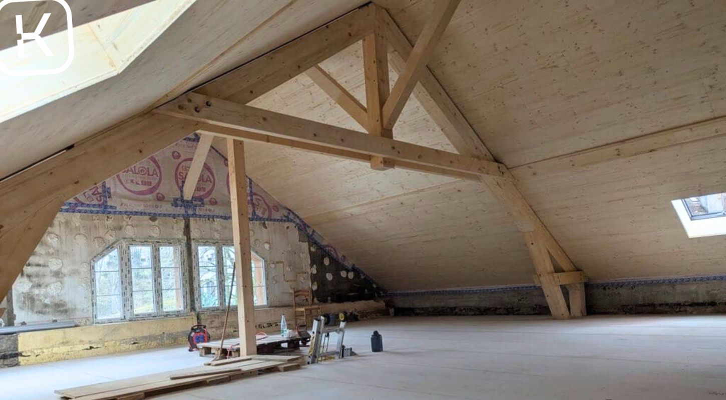 – Dépose du plafond des combles, des complexes de planchers, pose de murs en ossature bois de façade isolés et création d’un nouveau solivage.